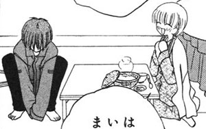 While she eats, Tohru confesses to Kyo that she is upset because her recent failure on her exams make her feel like she is failing on her promise to her mother to graduate high school. Kyo tells her that if she truly feels that way, she should erase the failure by making up for it on the supplementary exam. He tries to cheer her up by telling her that her down mood is not like her at all and that it's not the same without her cheerfulness brightening up the house. He offers to cook for her every day until she recovers, making her very happy.