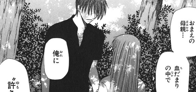 Kyo then goes on to tell Tohru that it was these last words that resulted in Kazuma taking him away for a four-month training trip in the mountains. He confesses that he wanted to kill himself but in the end, began to blame Yuki for everything that had happened and when Akito made the deal for him to win against Yuki, it made his hatred easier. Kyo asks if Tohru can ever forgive him because he can't forgive himself and doesn't want Tohru to either, coming back to Kyoko's last words.