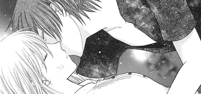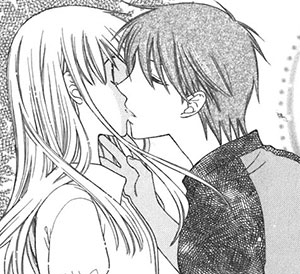 Kyo chases after Tohru and when he finally catches up to her, he holds her hand and apologises for making her cry and for hurting her. He asks her to give him the chance to be with her because he hates being without her and confesses to her that he loves her. Tohru is shocked and cries hard in happiness and Kyo calms her down by kissing her. (He also mentions it's not the first time and Tohru can't remember it at all! Oops!) Pulling Tohru to her feet, Kyo asks permission to hug her and says that the curse wlil give their relationship strange circumstances. Tohru just smiles and says that she doesn't care about any of that: she loves Kyo and that's all that matters.