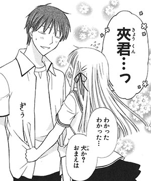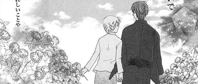 Tohru also tells Kyo that, without a doubt, Kyoko's last words were not born of malice toward him. Kyo speaks to Kyoko's grave and asks if it is okay to take Tohru away for a little while and vows to keep the promise he made to her as a child. A flashback from Kyoko's point of view occurs and it's revealed that, as she lay dying, her only thought was of Tohru and when she recognized Kyo, she tries to tell him that he must live up to his promise to take care of Tohru, else she wouldn't forgive him.