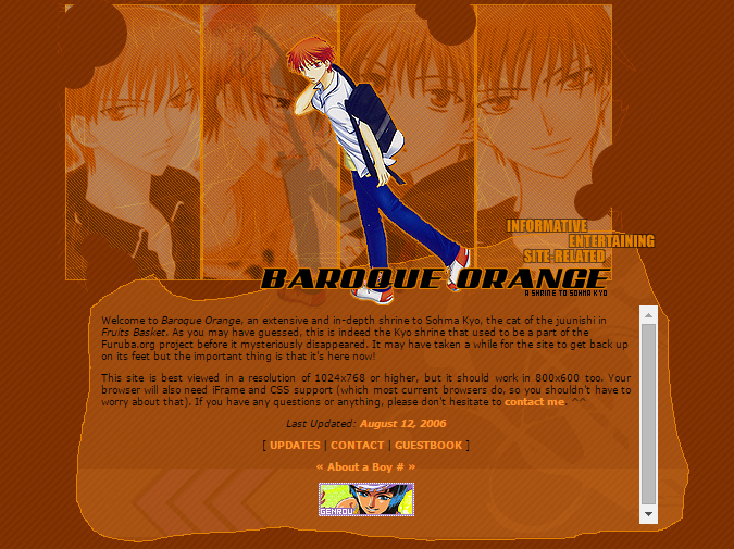 For a little bit of backstory, Baroque Orange was originally hosted on the now defunct Furuba.org. I was approached by a girl who wanted to create a Fruits Basket-centric domain containing a character site for each of the main characters in the series, among other miscellaneous things. I thought it sounded like a great idea since I was the founder of a similar project for Slayers so I agreed. Furuba.org had a "one site per character" rule so I was happy to take on the position of being the resident Kyo shrine.