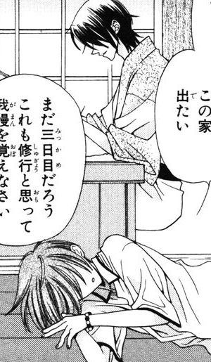As the primary adult in Kyo's life when Kazuma is absent, Kyo seems to confide in Shigure often. When Kyo is upset at having yelled at Tohru several times, Shigure tells him that he needs to learn to control his temper much like he controls his strength during martial arts training. He tells Kyo that in dealing with other people, sometimes he may get hurt and sometimes he may hurt others… but it's important to learn from those experiences to become a more understanding person. He encourages Kyo to keep practicing his people skills so that one day, when he meets someone who he grows to love, he will be prepared. Kyo takes this advice to heart and begins to work hard on controlling his actions, especially around Tohru.