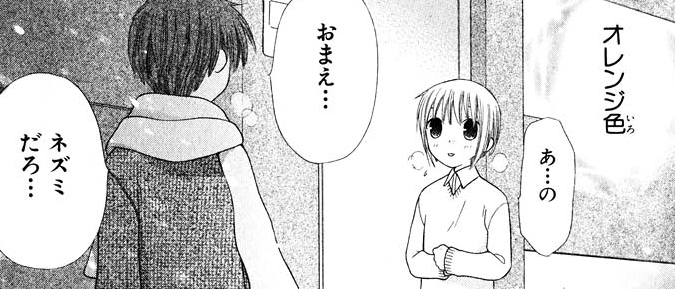 Uotani and Hanajima later drag both Yuki and Kyo out shopping for a new swimsuit for Tohru, telling them both that they're to chip in to cover the cost. They're both equally embarrassed to be in the store (which is too cute) and when Uotani asks them what colour they think Tohru would look good in, Kyo answers "orange" and Yuki answers "blue." Of course, they then begin to quarrel, insulting each other over their colour choices.
