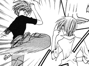 Yuki hits Kyo hard out of rage and asks if Kyo would be satisfied if he could magically catch someone falling off a cliff or miraculously save someone from being hit by a car; does he expect to be some kind of superhero? Kyo retaliates and shouts at Yuki, saying the role of superhero is his and that he would be more like Yuki if he could; he's always wished he could be like him. Yuki is completely dumbfounded and attacks Kyo, telling him to shut up because he was the one who wanted to be like Kyo. He reveals that he idolized Kyo when they were younger, yet Kyo is able to admit the same thing.