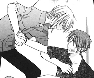 Both boys continue to quarrel with each other until it gets serious at the villa during summer holidays. Yuki grabs Kyo by the shirt collar and tells him that if he sees Akito, he had better control his temper so that Tohru doesn't get dragged into anything bad. Yuki reinforces this when Kyo is brought to the guest house on Akito's request. He laments that it's just like that first new year's celebration where Tohru was going to be left alone; Kyo says that he and all the other zodiac members are just as bad for leaving her. Yuki warns Kyo again not to lose it with Akito and Kyo becomes so angry he moves to punch Yuki but stops his fist within an inch of his face. Instead, Kyo punches the wall in frustration and continues on to Akito's room.